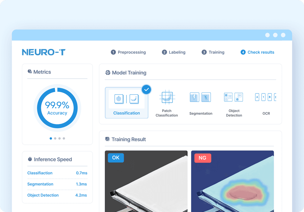 Neuro-T is a model training software that enables even non-experts to build high-performance deep learning models for vision inspection. It supports the entire workflow, including image data preprocessing, labeling, deep learning model training, and model evaluation. The “Auto Deep Learning Algorithm” embedded in Neuro-T automatically optimizes model architectures and training parameters, allowing users to easily develop high-performance deep learning inspection models.