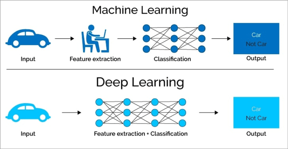 In contrast, deep learning learns useful features on its own from large amounts of data. The model identifies important patterns in the data without requiring humans to define each feature individually.