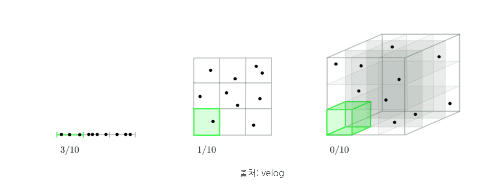 As shown above, as the dimensionality of data increases, it becomes more difficult to identify relationships with the same amount of data. This is referred to as the curse of dimensionality. As dimensionality increases, more data is required to build a good model, and if data is insufficient, overfitting may occur.
