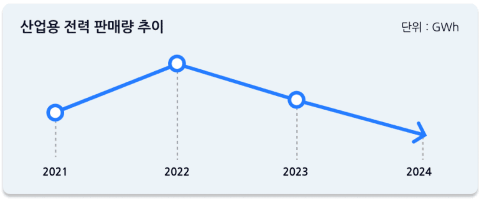 국내 제조업 위축으로 산업용 전력 판매량이 2년 연속 감소했으며, 올해도 3년 연속 감소 가능성이 제기되고 있습니다. 건설 경기 침체와 내수 부진으로 공장 가동을 중단하는 기업이 늘고, 산업용 전기요금 인상까지 겹쳐 부담이 가중되고 있는 것으로 보이는데요. 특히 제조업 전력 사용량은 자동차, 기계 장비 등 주요 업종에서 큰 폭으로 줄었고, 이는 경기 침체의 심각성을 보여주는 지표로 볼 수 있습니다.