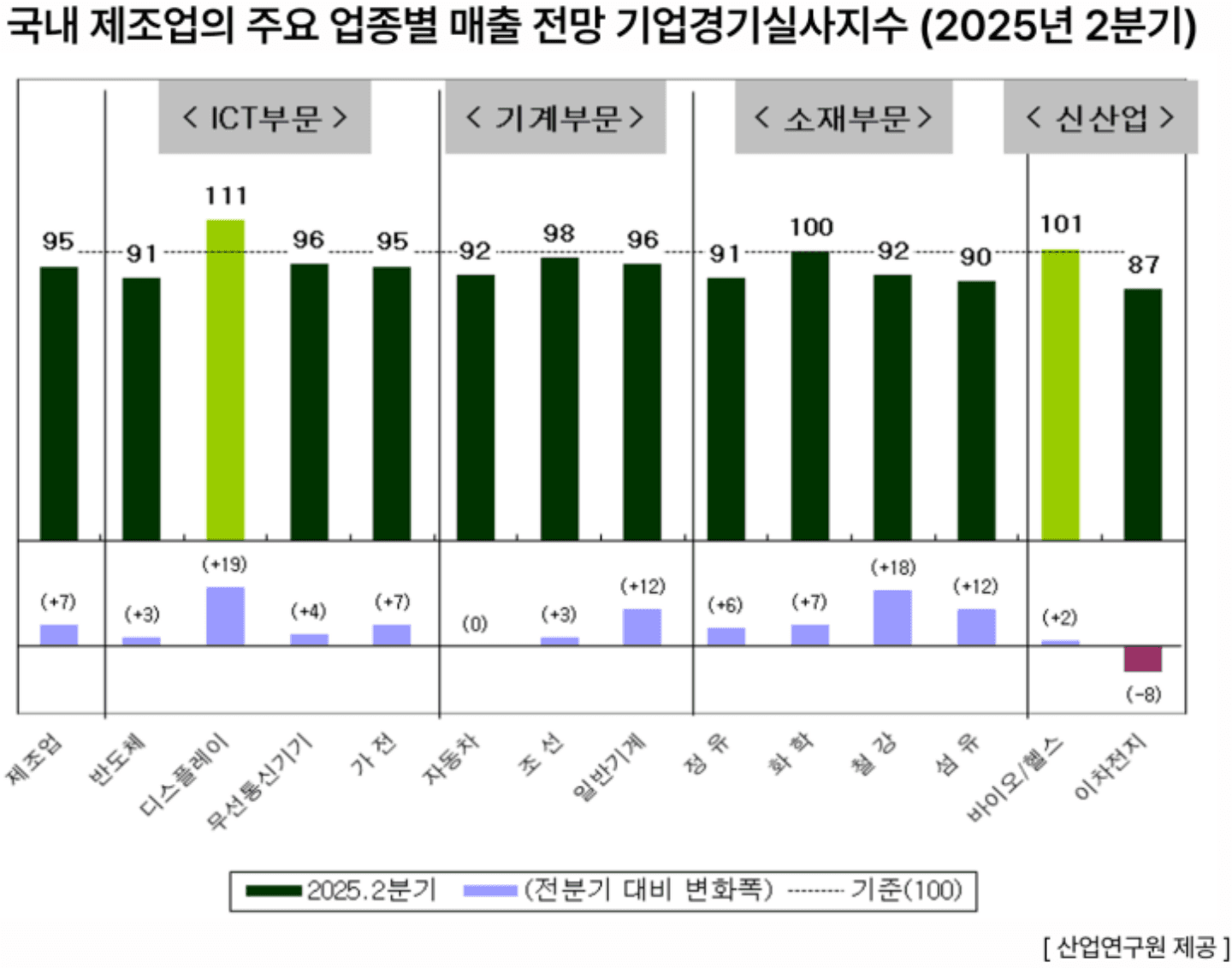 올해 2분기 한국 제조업 매출이 전 분기보다 감소할 것으로 보인다는 산업연구원의 조사 결과가 나왔습니다. 실제로 2025년 2분기 제조업 매출 전망 경기실사지수(BSI)는 95로, 이는 4분기 연속으로 기준선(100)을 하회하는 수치입니다. 반면 디스플레이는 111로, 기준선을 웃돌며 긍정적인 흐름을 보였습니다. 이에 대해 제조업체들은 내수 부진 및 재고 누증, 대외 불확실성 지속 등을 경영 활동의 부정적 요인으로 꼽았습니다. 또 다른 경영 리스크인 트럼프 관세 정책에 대해선 주력 품목 가격 경쟁력 저하, 거래비용 증가 및 이익 감소 등의 영향을 받을 것으로 전망하고 있습니다.